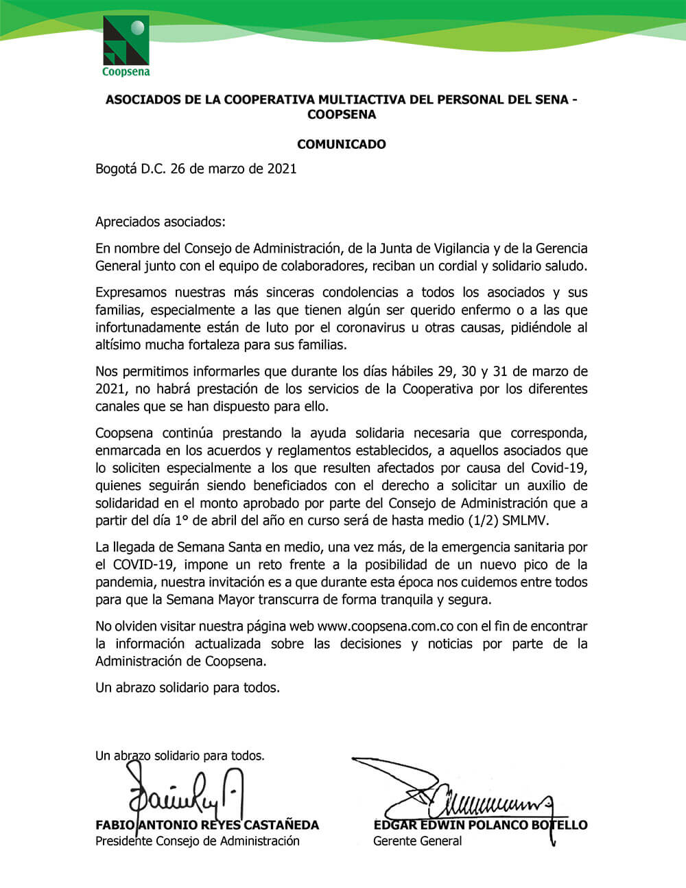 COMUNICADO COOPSENA MEDIDAS ADOPTADAS POR EL COVID-19