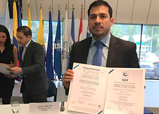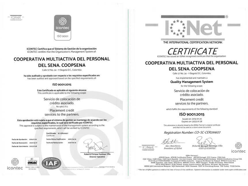 En el año 2008, obtuvimos la certificación del Sistema de Gestión de la Calidad, aplicable al “Servicio de Colocación de Crédito al Asociado”, por El Instituto Colombiano de Normas Técnicas y Certificación (ICONTEC), Organismo Nacional de Normalización de Colombia que entre sus labores destaca la reproducción de normas técnicas y la certificación de normas de calidad para empresas y actividades profesionales. ICONTEC es el representante de la Organización Internacional para la Estandarización (ISO), en Colombia.